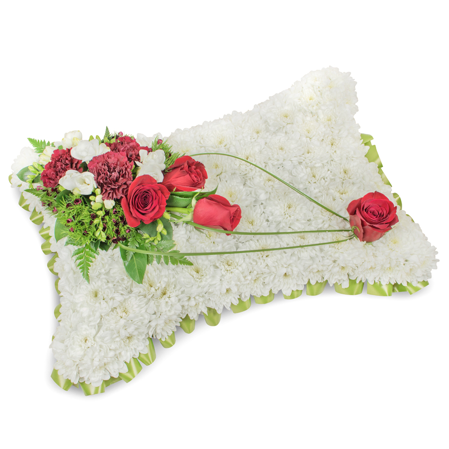 Express your deepest sympathy with our Sincerest Sentiments Cushion, a graceful funeral tribute handcrafted by Flower Delivery Wennington. This elegant cushion arrangement features pure white chrysanthemums as a soft base, adorned with rich red roses, white freesias, dark red carnations, dianthus and bear grass for refined texture and depth. Perfect for conveying heartfelt condolences at funerals, memorials or graveside services, this floral cushion offers a timeless way to honour a loved one. Expertly arranged for balance, colour harmony and lasting freshness, it measures approximately 45cm x 60cm, making a striking yet tasteful display. Roses are delivered with their natural guard petals to protect the inner blooms during transit; simply remove them on arrival for a flawless finish. As some stems are seasonal, our skilled florists may substitute flowers with similar colours and equal or superior quality to maintain the overall style. Available for reliable local delivery in Wennington and surrounding areas, this premium sympathy cushion allows you to send a thoughtful, comforting message when words are not enough. Order online from flowerdeliverywennington.co.uk for a beautiful, professionally arranged tribute.